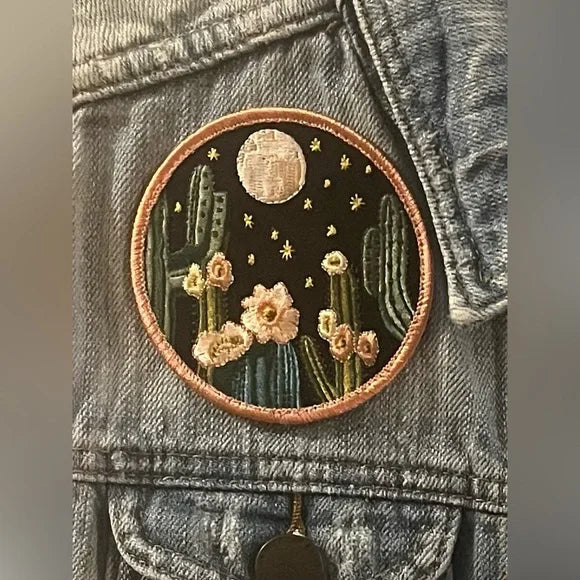 This denim jean vest has been custom embellished by myself, dianajeanne75. The vest was originally made by I LOVE H81 - Premium Denim in Los Angeles. The back panel has been added and comes from a piece of vintage feed sake with a Mexican print of hats and cactus. Machine stitched. On the font, there are added metal studs and a cactus moon patch. Size Medium. PTP across the back is 18 1/2” - you can wear it open or closed. Buttons up the front.