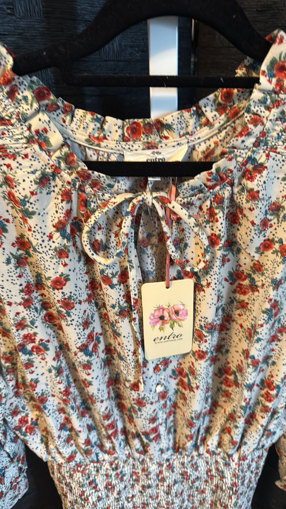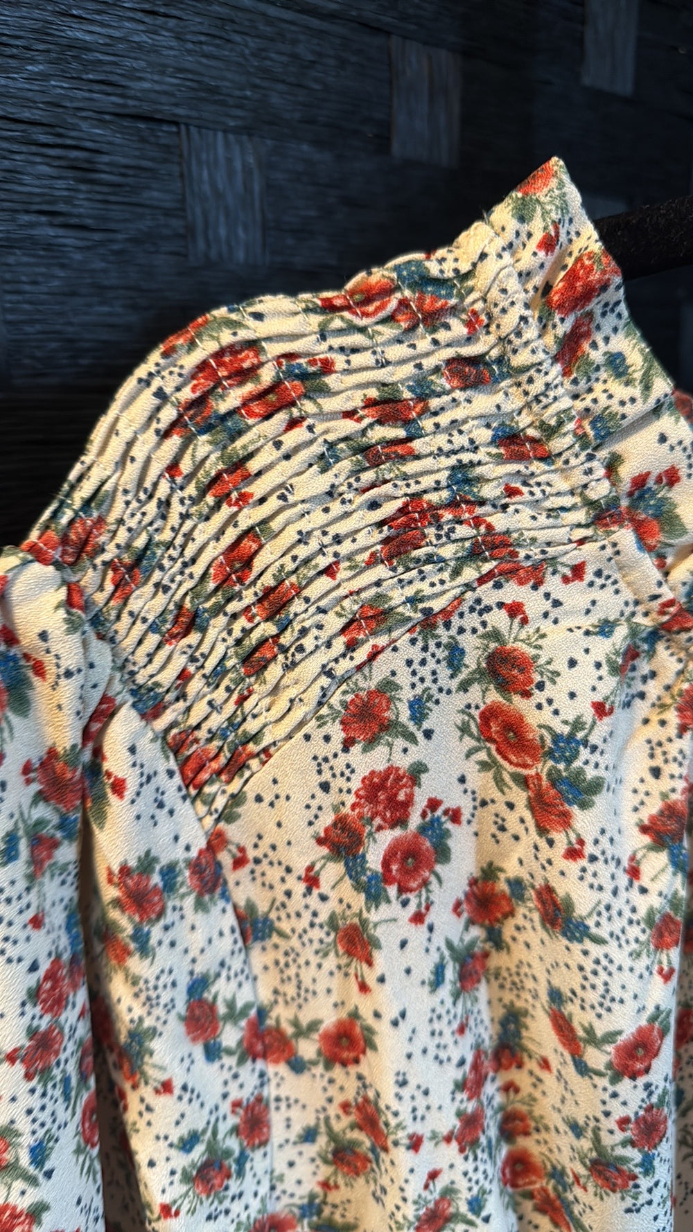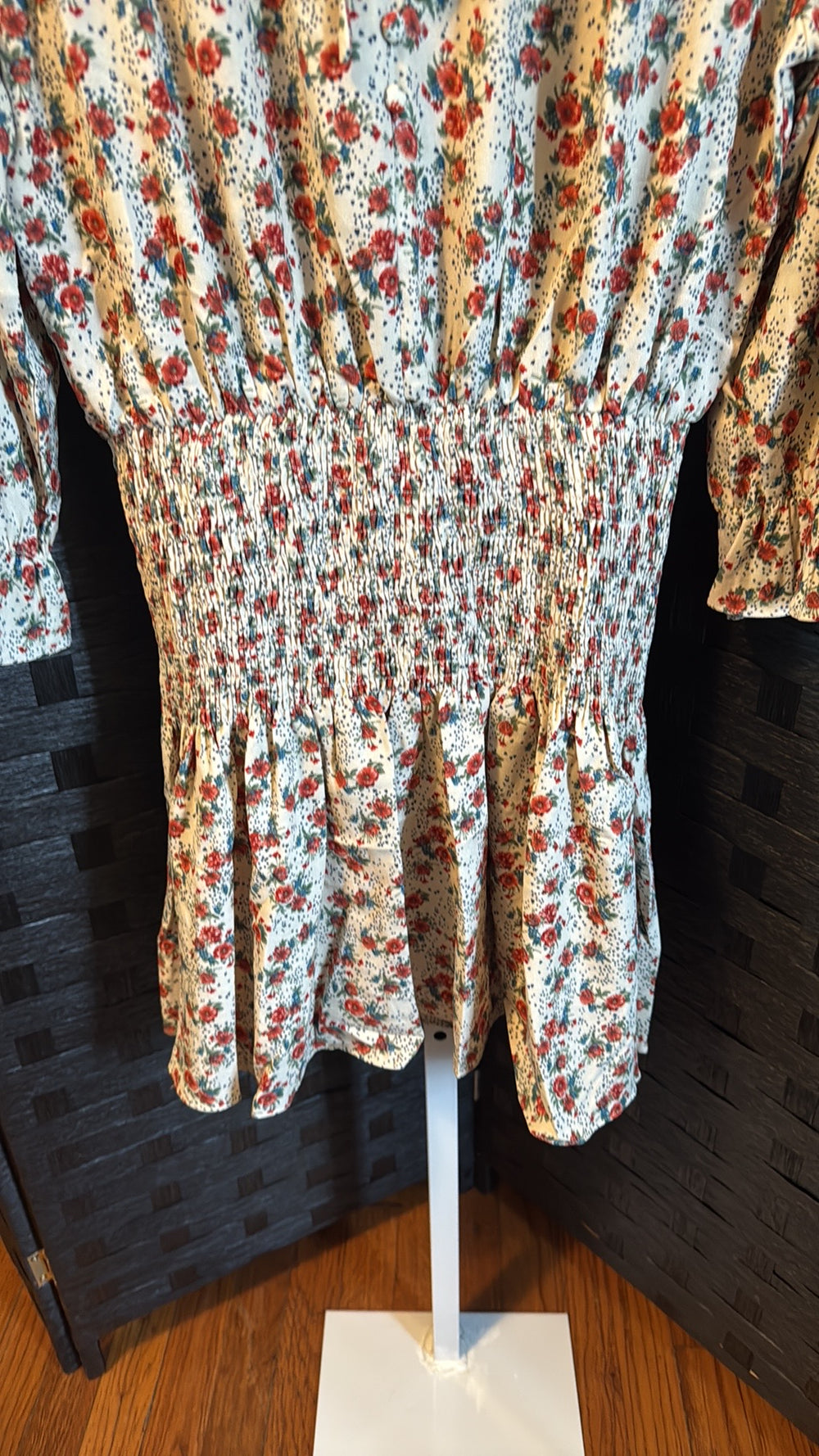 Elegant dress with floral pattern. Features a tie-neck, ruffles. Cut out in the front three covered buttons lots of smocking and ruffled sleeves. The skirt is lined. Comes with it’s extra button. Size Large 22-23” PTP Polyester