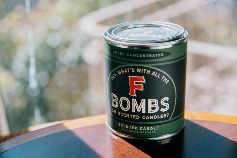 Hey, what's with all the F bombs on scented candles? Bomb Pop Scented Notes of cherry and lime Net Weight: Approximately 12 oz. Burn time: 40 hours Note: Because all of our candles are handmade, no two are identical. © 2021 Whiskey River Soap Co. Candle can size: 3 ¼" D x 3 ⅞" H