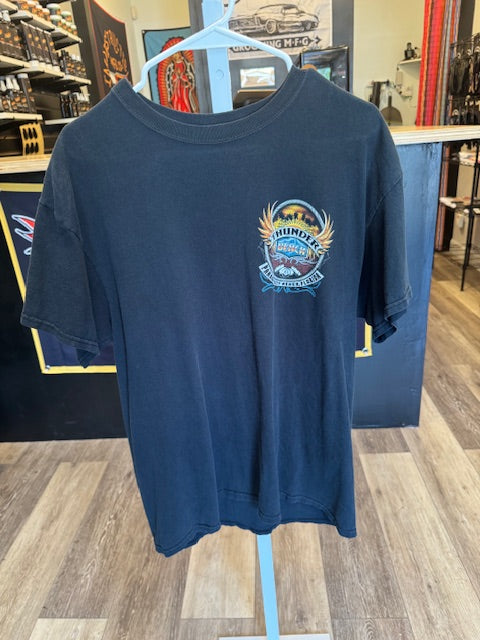 The product is a 2016 Thunder Beach Spring Rally 18th Anniversary t-shirt in size L, designed for men and made of cotton material. The shirt is in black color with no tag branding. This item is a piece of automotive merchandise related to the Thunder Beach Spring Rally event held in Panama City, Florida. Ideal for fans of the rally or those looking for a comfortable and unique apparel option.