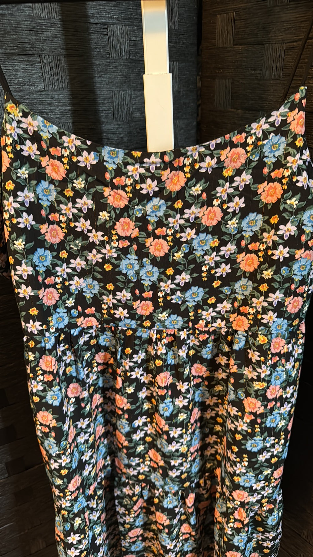 Charming floral dress with spaghetti straps. Features a vibrant floral pattern on a black background. Perfect for summer! Side zipper. Ruffle tier skirt Size Large 20-20.5” PTP Polyester with Metallic Threading